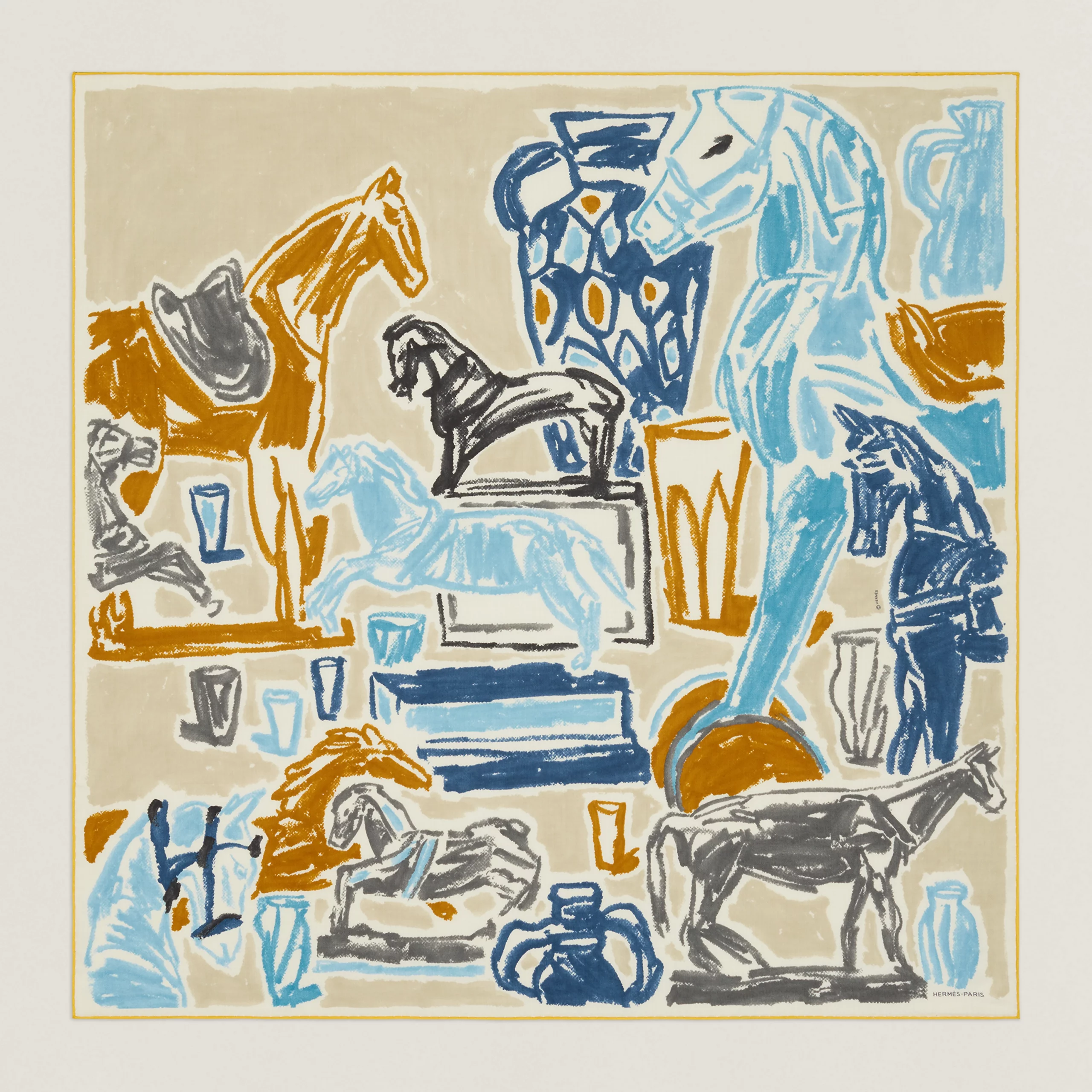 When you step into the Emile Hermès collection, you enter a world where the horse is omnipresent; found on objects ranging from the most precious, essential and lightest to the most delightfully playful, surprising and cheerful. Chevaux de la Collection 1 evokes the spirit of this fantasy with his rapid, freehand lines in oil pastels. In this joyful medley we can see the Hermès family’s historic rocking horse, numerous representations of horses at a walk or gallop, as well as vases and glasses decorated with all sorts of equestrian scenes.2