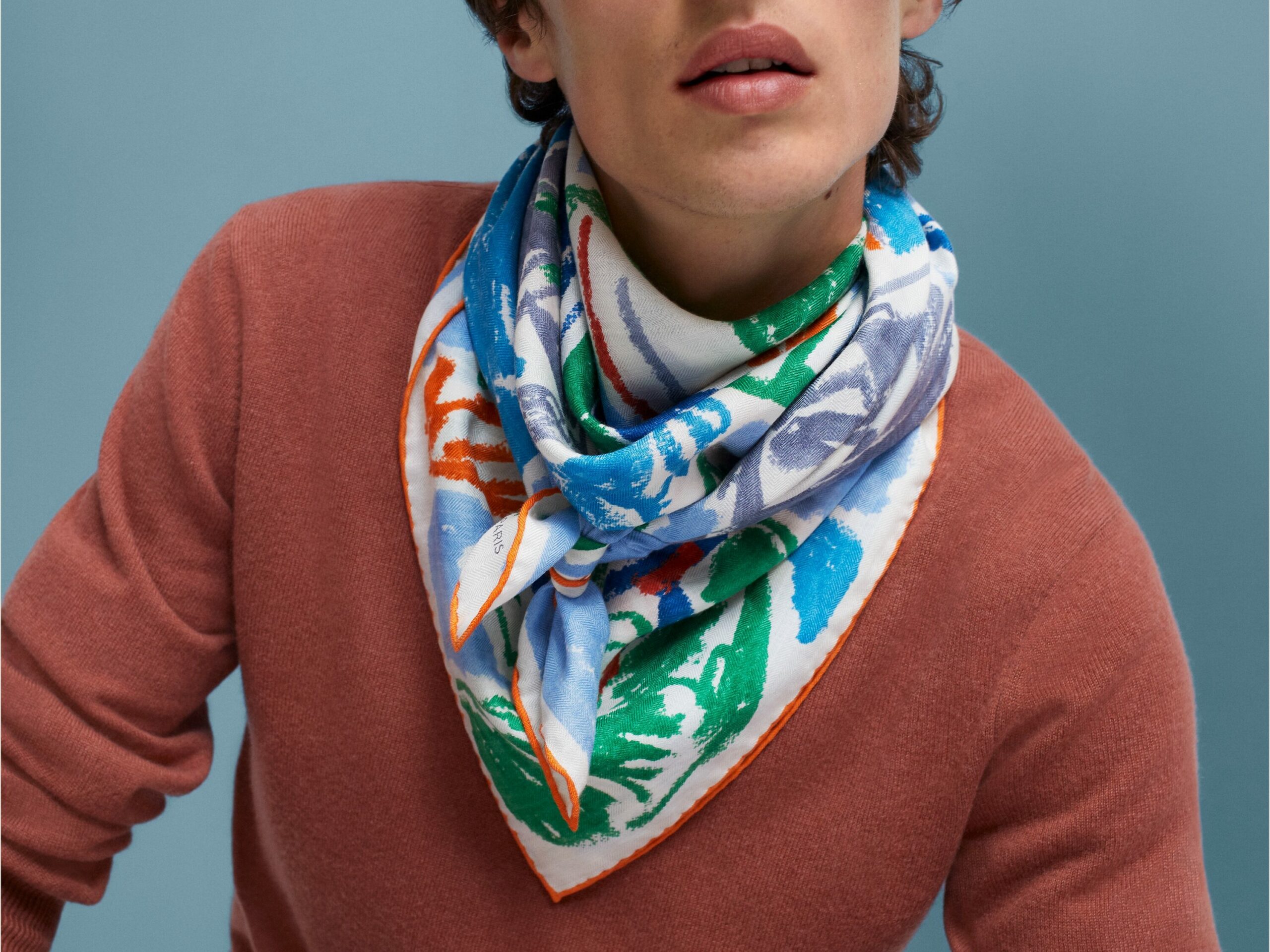 - Scarf in cashmere and silk with hand-rolled edges (H103943T) 100 x 100 cm ↩︎